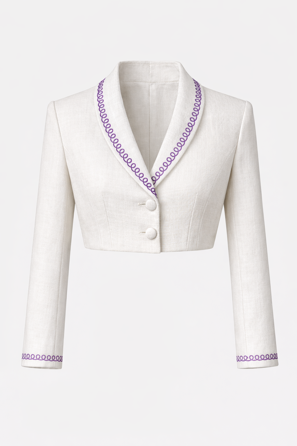 Feminine style reinvents the summer suit with anti-fitted ivory white linen, finished with an embroidered loop trim. A slightly wide cut and double button detail feel youthful yet polished.